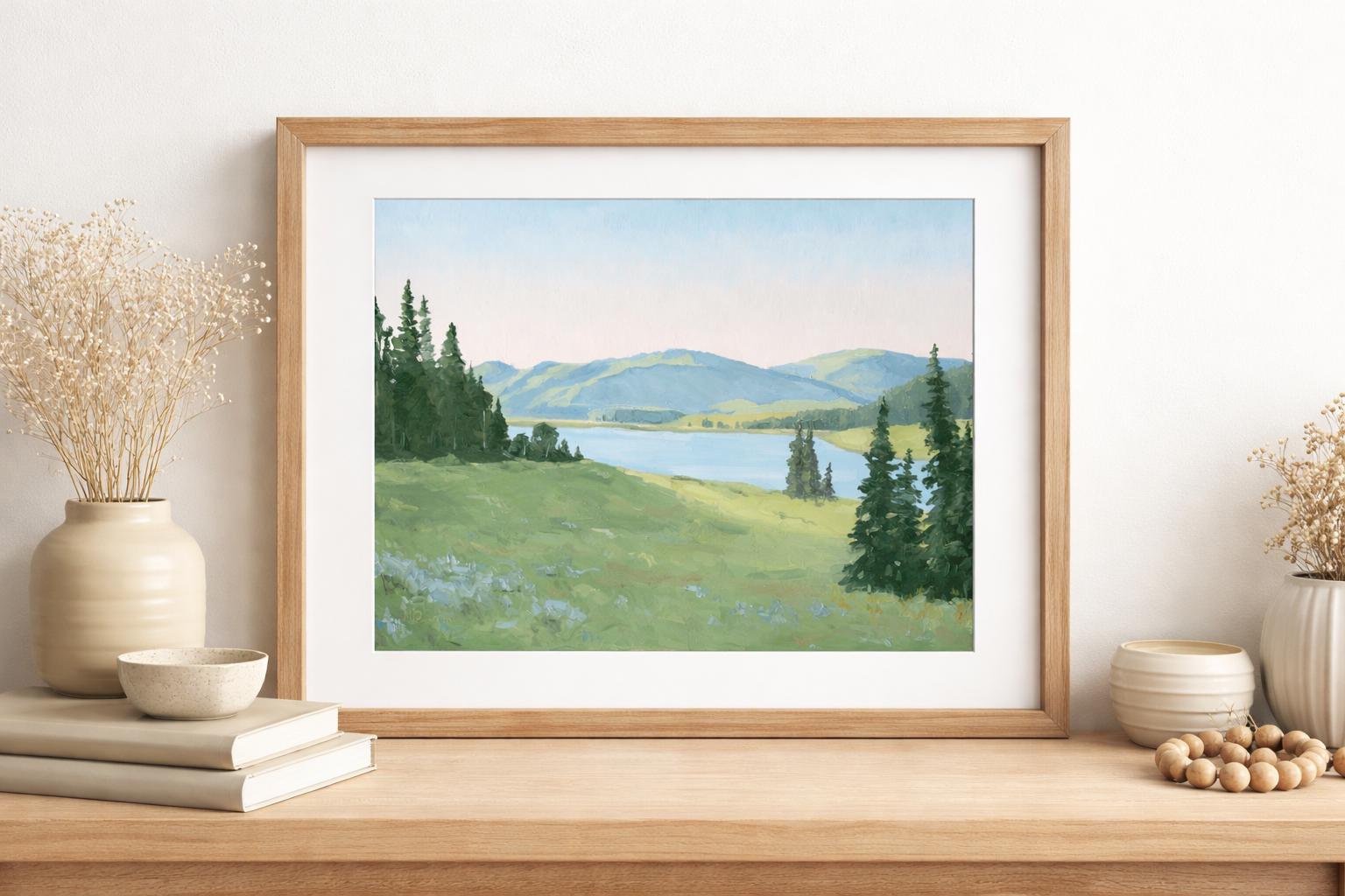 This fine art photo print of an original oil painting by McKenzie S. Paxton captures the serene glow of early morning over Huntington Lake.